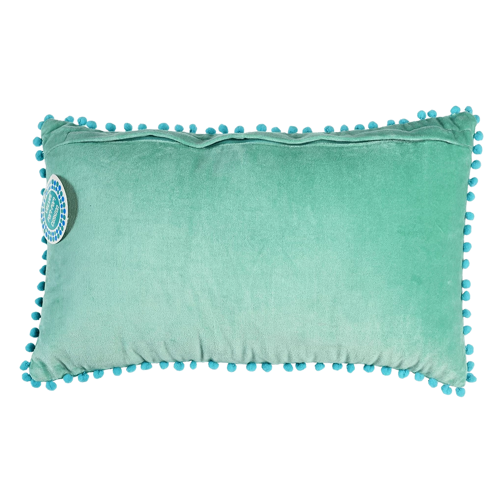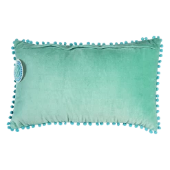 Cheer up your home with this colourful aqua cushion! Featuring teal pom poms and a soft velvety texture, this cotton cushion will brighten up any sofa or chair.