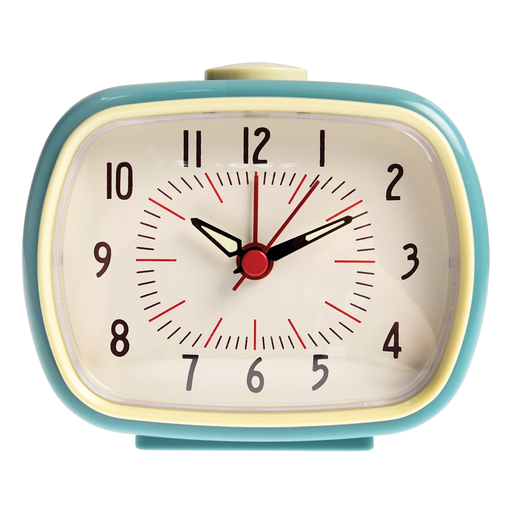 Perfect for camping or for a retro room, this light blue alarm clock has glow in the dark hands and a traditional alarm.