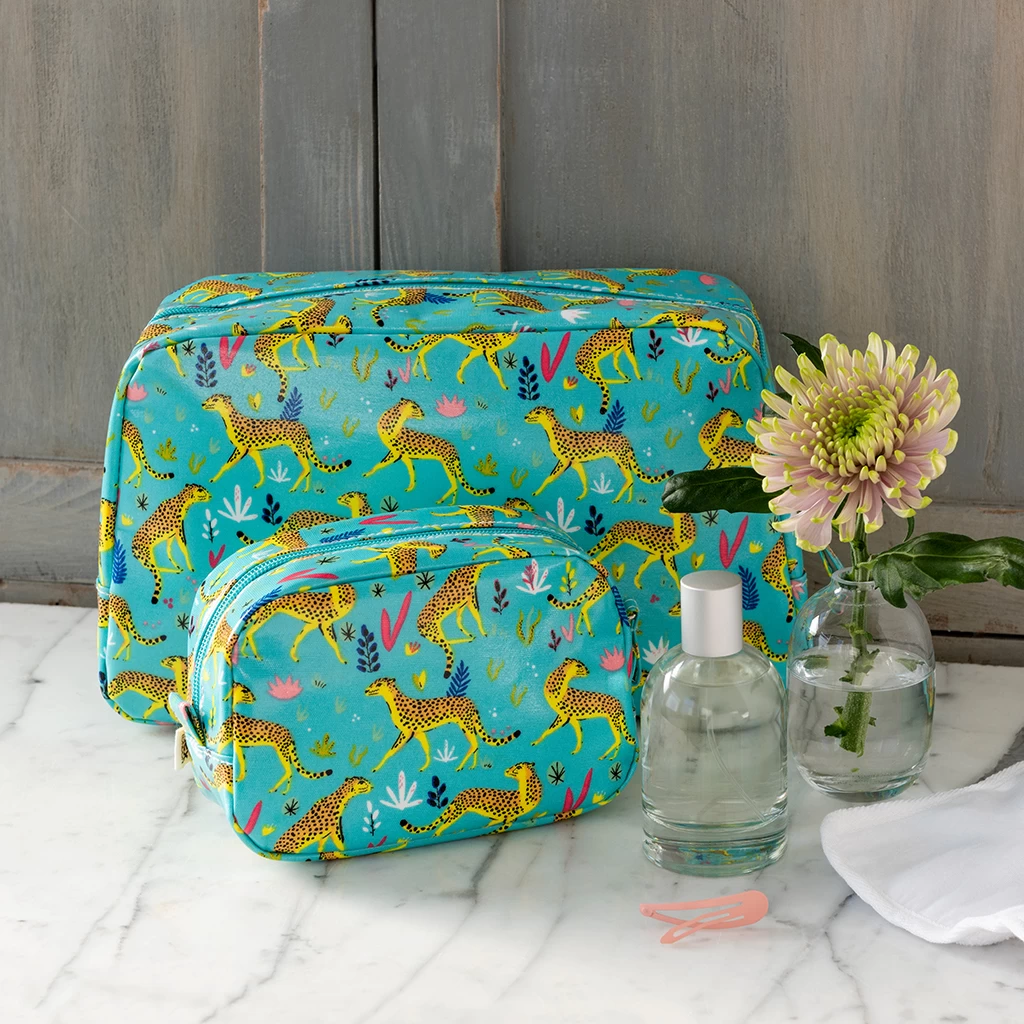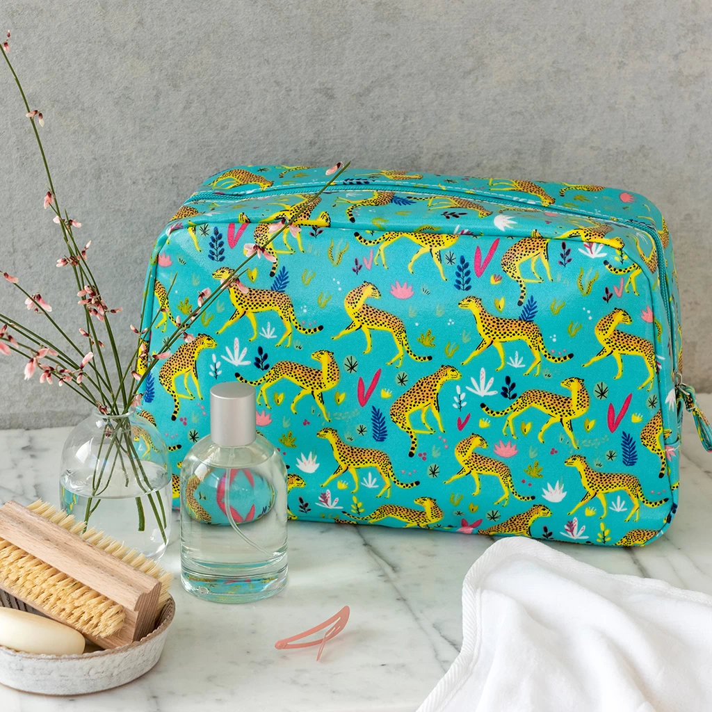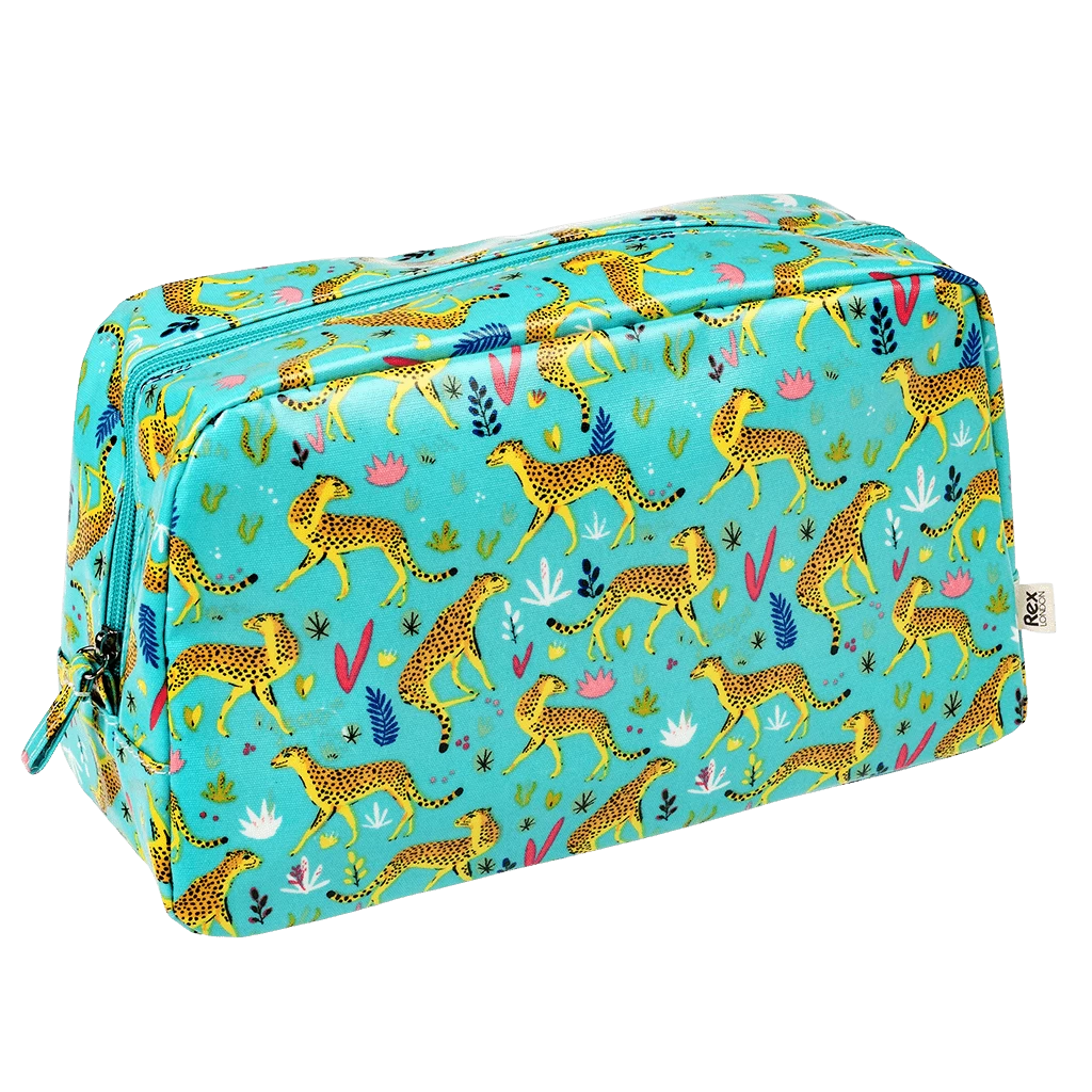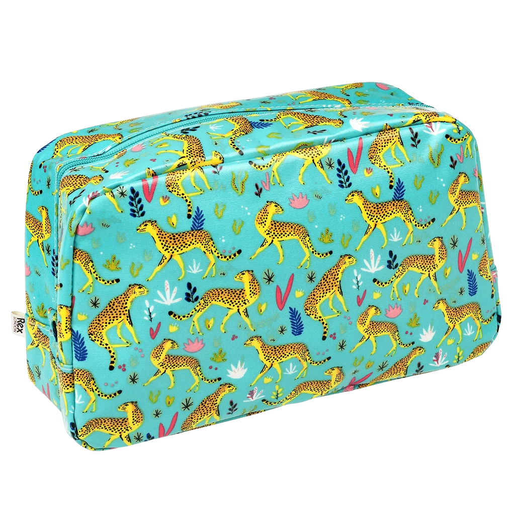 Keep your toiletries safe in style on your travels with this spacious and stylish Cheetah oilcloth wash bag, featuring a handy internal pocket.