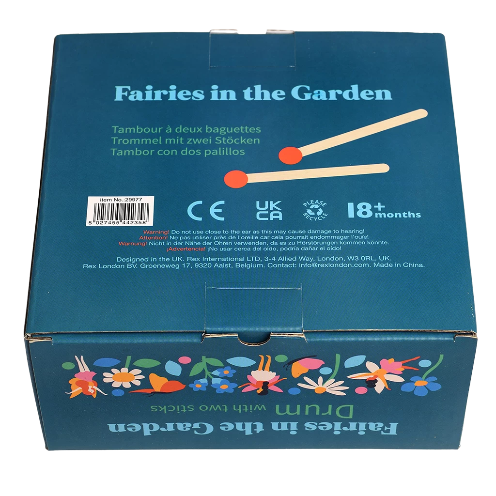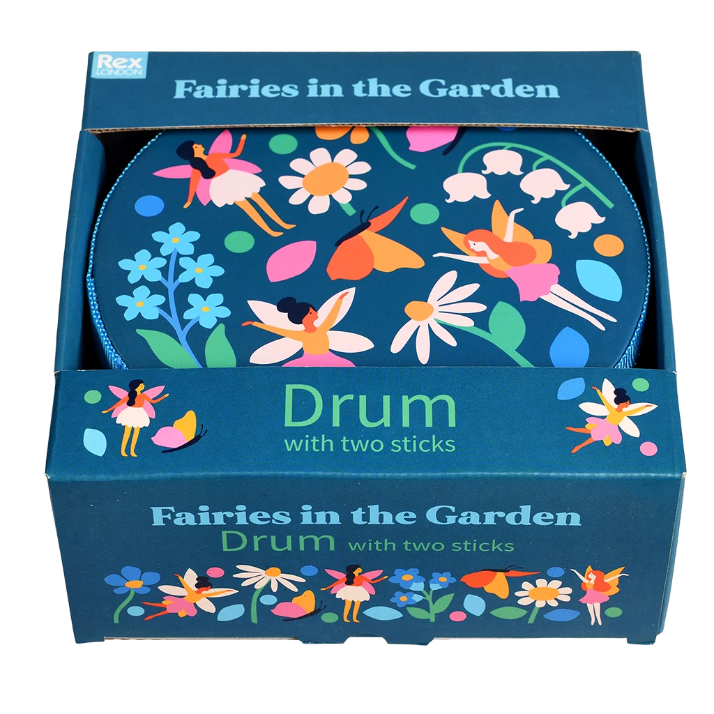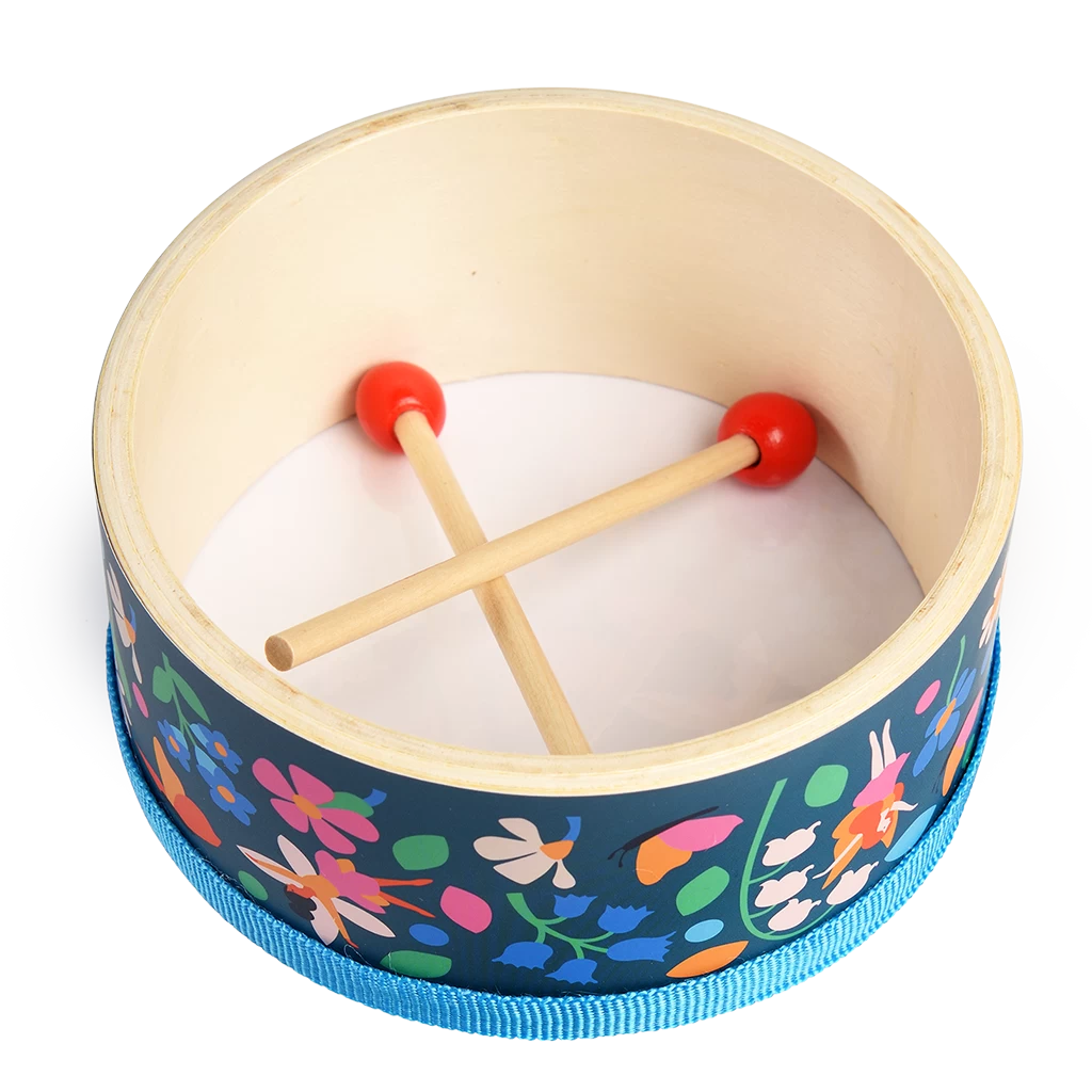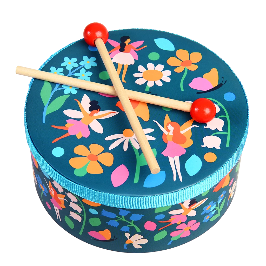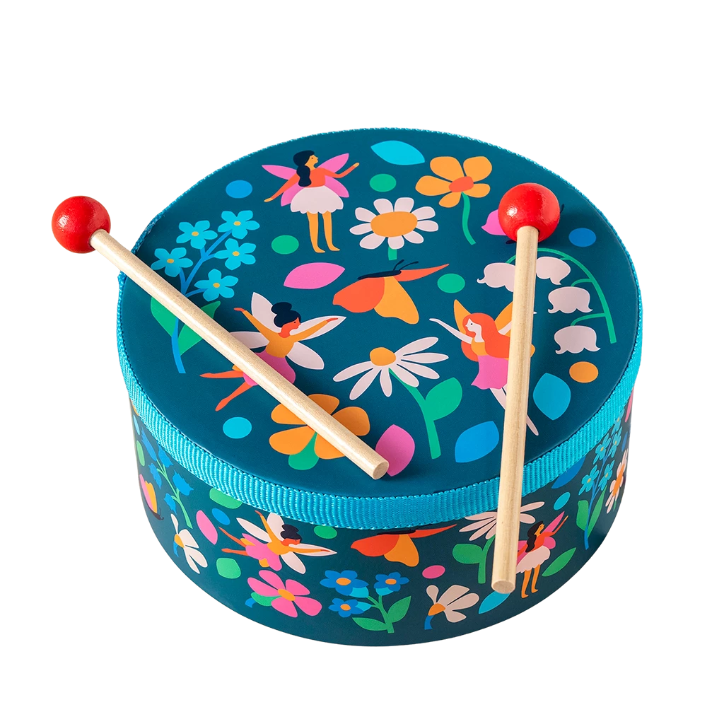 Get ready to make some noise with our dancing fairies! A drum is a great way to introduce little ones to rhythm, and cause and effect. This one include a pair of drumsticks, and features our pretty Fairies in the Garden print.