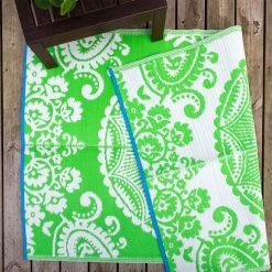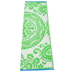 Say no to dull interiors with this bright green floor mat, with a blue trim! This eco-friendly floor mat is handmade in India from recycled plastic, and features a vintage pattern inspired by traditional Indian rugs.