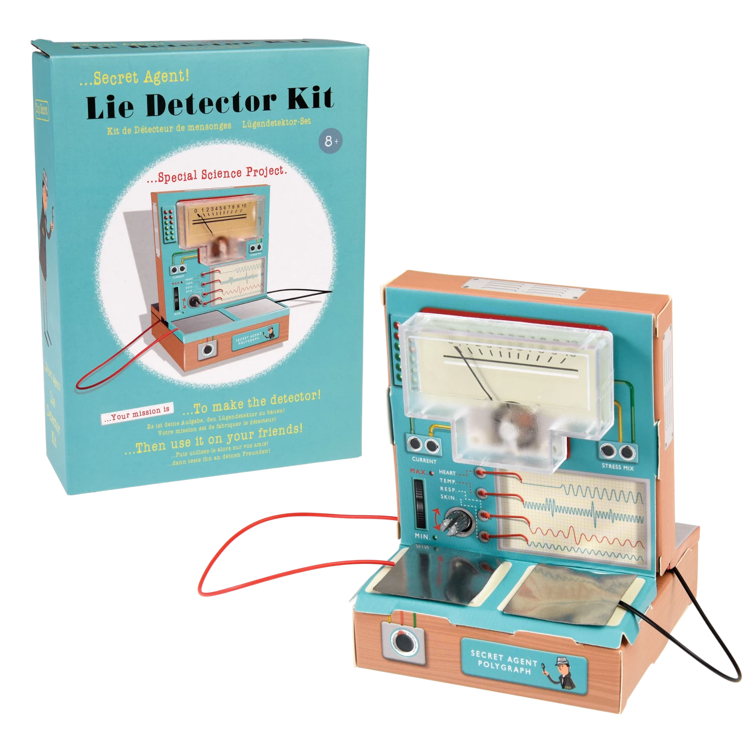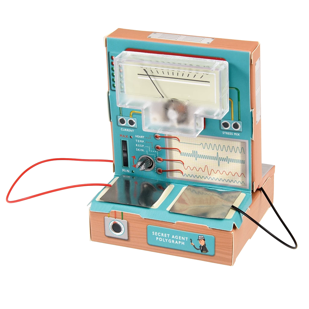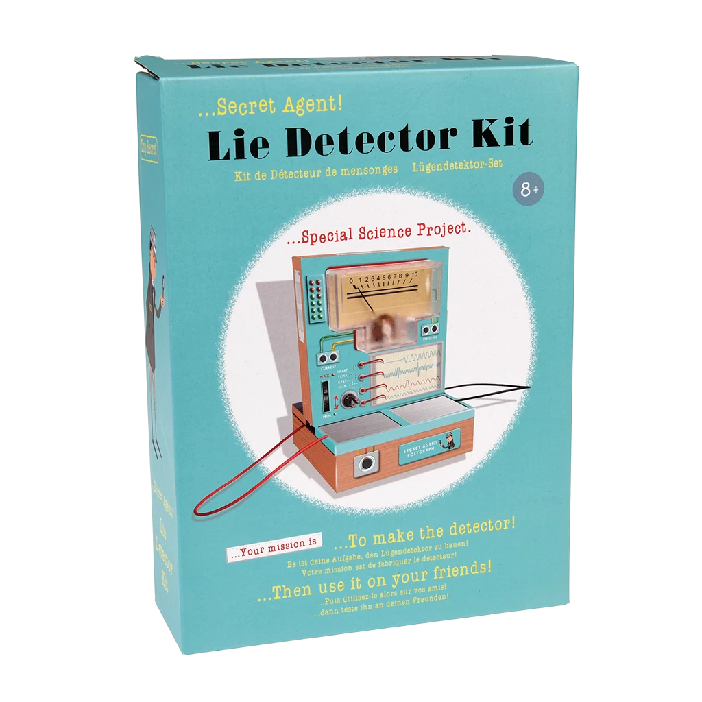 WARNING! Choking hazard; small parts. To be used under direct supervision of an adult. Please read instructions carefully before use. Batteries to be inserted with correct polarity. When not using the product for extended periods of time, remove the battery for storage. Retain all packaging for future reference. This is a toy that reads electrical resistance caused by sweat, it cannot guarantee if someone is telling the truth or lying. Store this product away from high temperatures, humidity and direct sunlight.