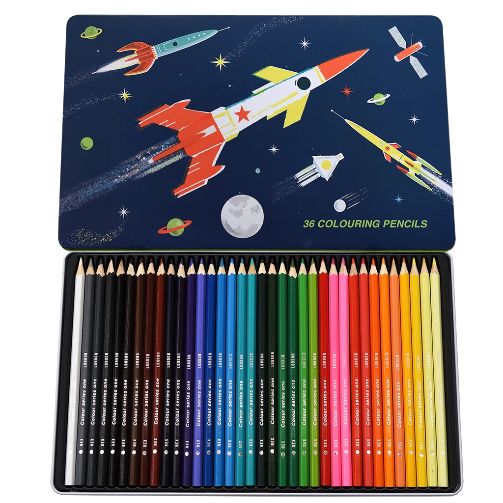 This Space Age tin contains 36 colouring pencils, perfect for drawing and doodling with all the colours of the rainbow. An ideal gift for a budding artist or a seasoned sketcher.