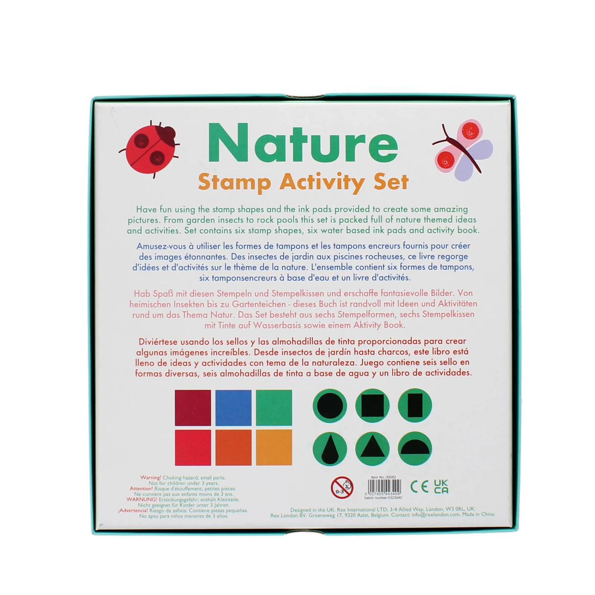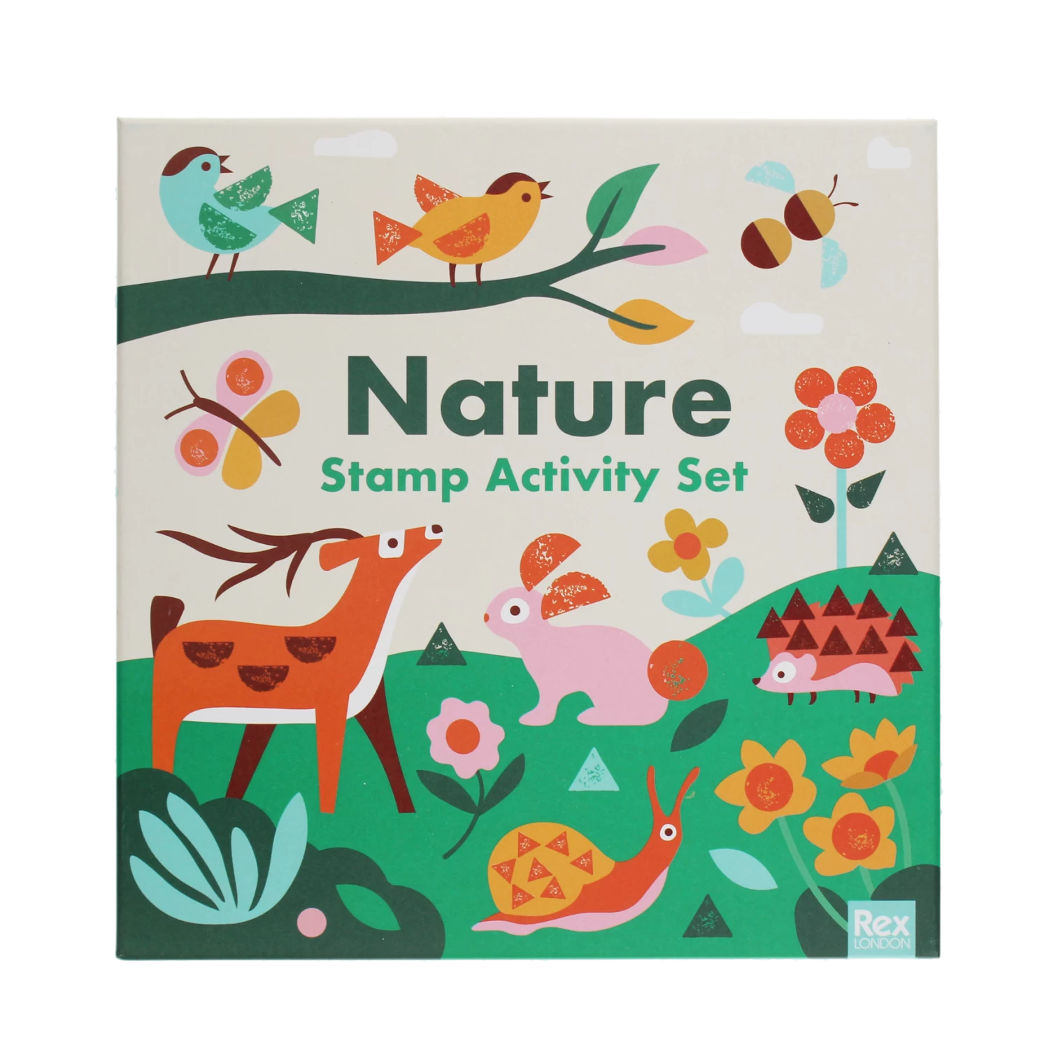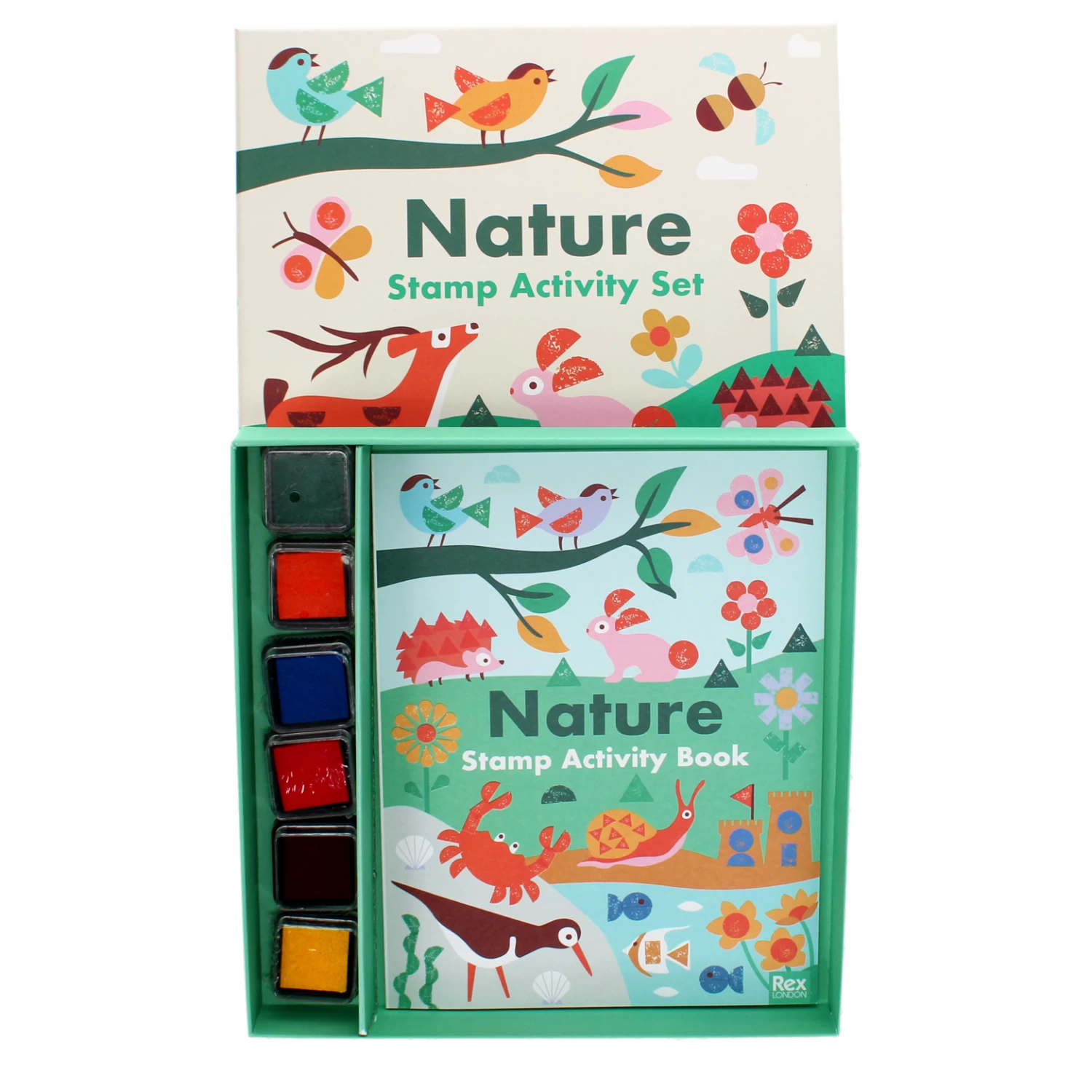 Create some amazing nature-themed pictures with this charming and engaging stamp activity set! Use the shaped stamps and ink pads to add fins to a shark, give a hedgehog his spikes, or decorate flowers, trees, snowmen and more.
