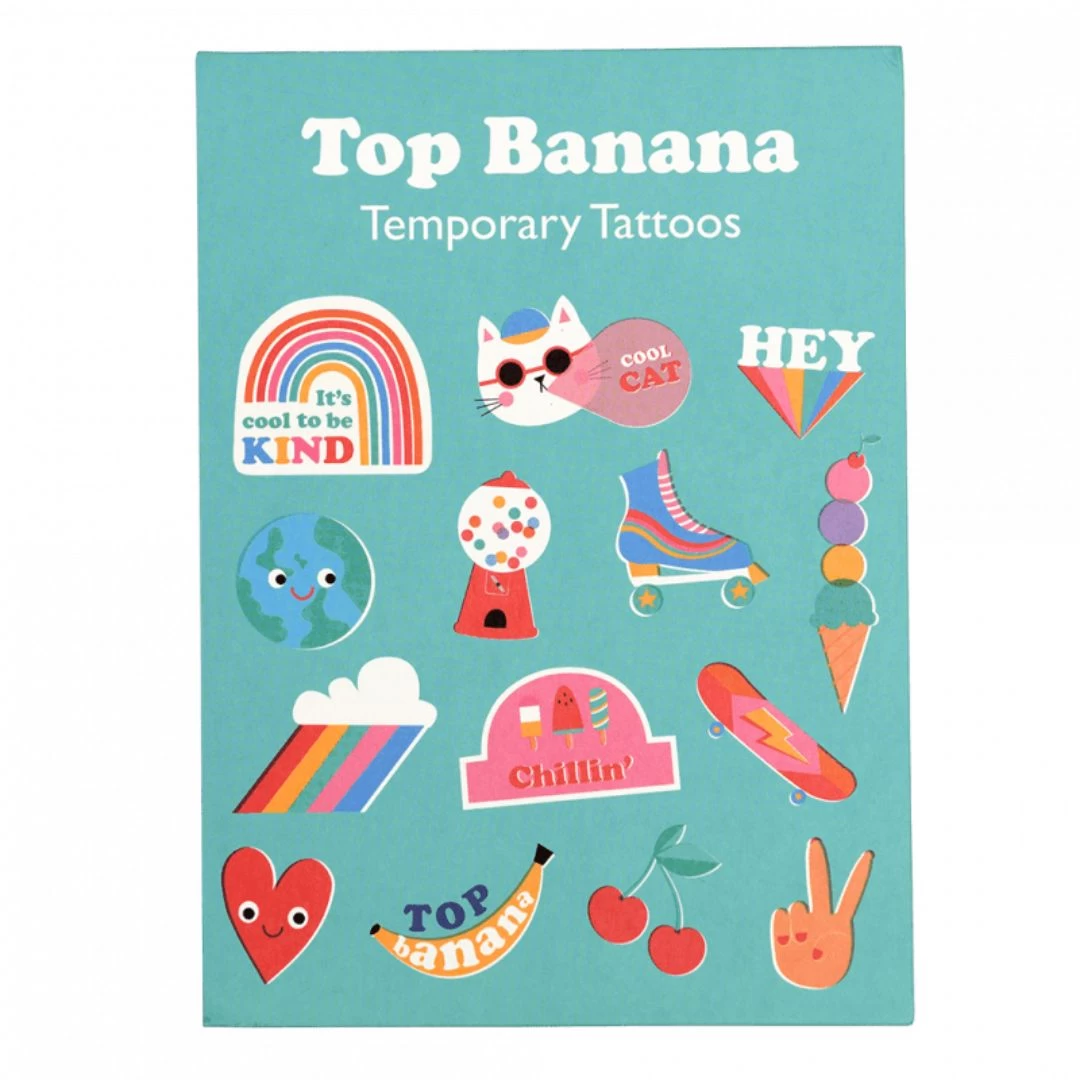 Two sheets of fun Top Banana temporary tattoos, ideal for party bags, stockings, festivals and children’s parties