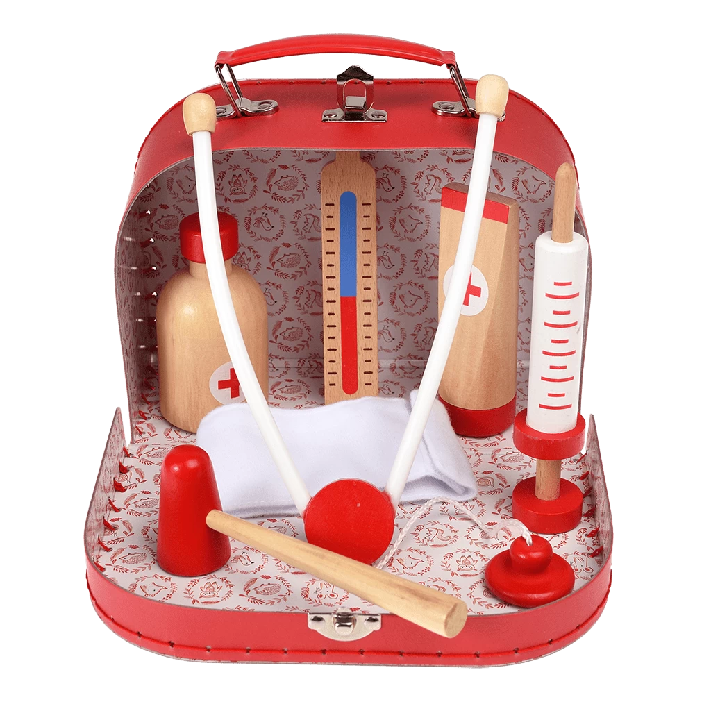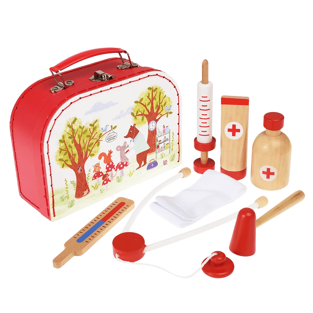 Help children to care for their poorly toys with this fun wooden play set, ideal for doctor or vet role play. This play set is ideal for helping children to develop their social skills and empathy, as well as their imagination. This charming wooden set comes in a cardboard case that can be used as their very own doctor’s bag!